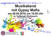 Einladung: Jugendforum Nordstadt lädt zu einem interessanten Musikabend mit der Band Gypsy Mafia im Treffpunkt Stollenpark ein. Die Gypsy Mafia ist eine 2006 gegründete Roma-HipHop-Gruppe aus der serbischen Stadt Zrenjanin. Sie begeistern das Publikum mit ihrer Musik, ihrem Sound und kritischen Texten, in denen sie die Politik und die rassistische Gesellschaft in Serbien aufgreifen. Ihre Musik setzt ein klares Zeichen für ein Miteinander und Toleranz.
