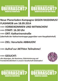 +++ START: 16.30 Uhr +++ ORT: Katharinenstraße (oberhalb der Katharinentreppe gegenüber vom Hauptbahnhof) +++ ZIEL: Vorurteile ABBAUEN! +++ Aufruf zur AKTIVen Teilnahme! +++ GESUCHT: alle diejenigen, die Rassismus, Diskriminierung und Fremdenfeindlichkeit in unserer Gesellschaft bekämpfen!