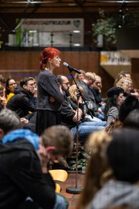 Hengameh Yaghoobifarah, die gemeinsam mit Fatma Aydemir Herausgeberin des Bandes ist, trug auf der Lesung Auszüge aus ihrem Text „Blicke“ vor. Ihr geht es um die Macht, die Blicke haben können: Welcher Blick, welche Perspektive entscheidet, wer dazu gehört und wer nicht? Wenn sie sich in der Öffentlichkeit bewege, mache sie die Erfahrung: „Blicke scannen dich ab, und du merkst: The kanak is present“ heißt es im Text. Rassismus darf aber nicht nur das Problem derer bleiben, die betroffen sind, so der Tenor der Lesung und des anschließenden Publikumsgesprächs. Bei Rassismus handle es sich um ein strukturelles Problem, das von allen abverlangt, aktiv dagegen vorzugehen. Dies sei zwar ein schmerzlicher Prozess, wie Nadia Shehadeh betonte, jedoch zwingend notwendig, denn „Der Rassismus verschwindet nicht einfach so.“ Auf die Frage aus dem Publikum, warum sie denn selbst in ihrem Titel zwischen „wir“ und „ihr“ unterschieden habe, antwortete Yaghoobifarah dann auch, mit „wir“ seien alle gemeint, die nicht einverstanden seien mit diesem Heimatbegriff, gemeinsam müsse man Allianzen bilden.