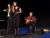 Im zweiten Teil des Abends führte die Musikerin Dotschy Reinhardt zusammen mit ihrem international besetzten Ensemble die Gäste durch die musikalische Darbietung. Es wurden Interpretationen bekannter Songs wie „Down Here To The Ground“ von Grant Green und selbstgeschriebenen Werken aus ihren Alben „Sprinkled Eyes“ und „Suni“ aufgeführt. In Englisch und Romanes ermutigten die Texte zur Selbstbehauptung und zum Empowerment gegenüber Diskriminierung. Auch Stücke von Django Reinhardt kamen nicht zu kurz, so dass der Eine oder die Andere Besucherin mit einem Ohrwurm nach Hause ging. Das gut aufgelegte Trio sorgte mit diesen heiteren Stücken von Gypsy-Swing bis Impro-Jazz für einen gelungenen Abschluss des Abends.