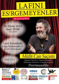 Müfit Can Saçıntı, bekannt durch den Film Mandira Filazofu und das Theaterstück Aranan Adam, begrüßt das Publikum mit seinem neuen Stück "Lafını Esirgemeyenler".