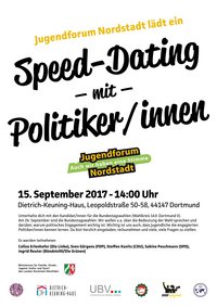 Beim Speed-Dating werden die Jugendlichen jeweils 10 Minuten mit den Bundestagskandidat/innen der jeweiligen Parteien in einem kleinen Gesprächskreis sprechen. Die fünf kleinen Gesprächsrunden werden von Jugendlichen des Jugendforums Nordstadt moderiert. Die Veranstaltung am 15.9. soll ca. 2 Std. dauern.