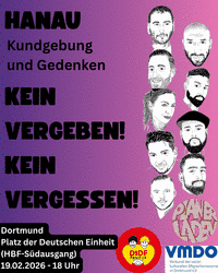 Am 19.02.2026 jährt sich der rassistische Anschlag von Hanau zum sechsten Mal. Neun Menschen wurden aus rassistischen Motiven ermordet. Am 19.01.2026 fordert der Anschlag ein weiteres Opfer - Ibrahim Akkuş verstirbt an den Nachwirkungen des Anschlags. Wir kommen zusammen, um zu gedenken, um die Namen nicht zu vergessen und um ein Zeichen gegen Rassismus, rechte Gewalt und Hass zu setzen.