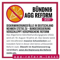 Diskriminierungsfälle in Deutschland nehmen stetig zu, während die Bundesregierung die versprochene Reform verschleppt: Das Allgemeine Gleichbehandlungsgesetz (AGG) wird am 18. August 18 Jahre alt. Das Gesetz weist seit Inkrafttreten massive Schutzlücken auf, trotzdem fand in dieser Zeit keine umfassende Reform statt. Obwohl im Koalitionsvertrag vereinbart, setzt die Regierung die Reform nicht um.