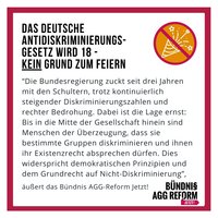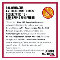 “Wenn sich über 100 Organisationen aus unterschiedlichsten Bereichen, aus ganz Deutschland, auf 11 Forderungen für die AGG-Reform einigen können, dann ist es ein Armutszeugnis für Deutschland, wenn drei Koalitionsparteien keinen Konsens zustande bringen und der Mut für mehr Fortschritt fehlt. Diskriminierung ist kein ‘Nischenthema’, sondern betrifft einen Großteil der Gesellschaft", sagt Rebecca Kronsteiner (Berliner Fachstelle für Arbeitsmarkt und Antidiskriminierung und Mitglied im Bündnis AGG-Reform Jetzt!).