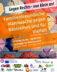 Aktiv gegen Rechts, schon von Kindesalter an! Anknüpfend an die von den Quartiersdemokraten ins Leben gerufene Aktion der Mahnwachen für Demokratie bietet der Treffpunkt KEZZ des Planerladens zusammen mit weiteren sozialen Einrichtungen und Orten des zivilgesellschaftlichen Engagements der Nordstadt Kindern, Jugendlichen und deren Familien die Möglichkeit, zu zeigen, was sie von Rassismus und Diskriminierung halten. Die „Familienfreundliche Mahnwache gegen Rassismus und für Vielfalt“ findet am 26. April, 16:30 Uhr am Stargate im Blücherpark – Blücherstraße Ecke Lessingstraße statt.