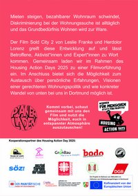 Gemeinsam laden wir im Rahmen des Housing Action Days 2025 zu einer Filmvorführung ein. Im Anschluss bietet sich die Möglichkeit zum Austausch über persönliche Erfahrungen, Visionen einer gerechteren Wohnungspolitik und wie konkreter Wandel von unten bei uns in Dortmund möglich ist.