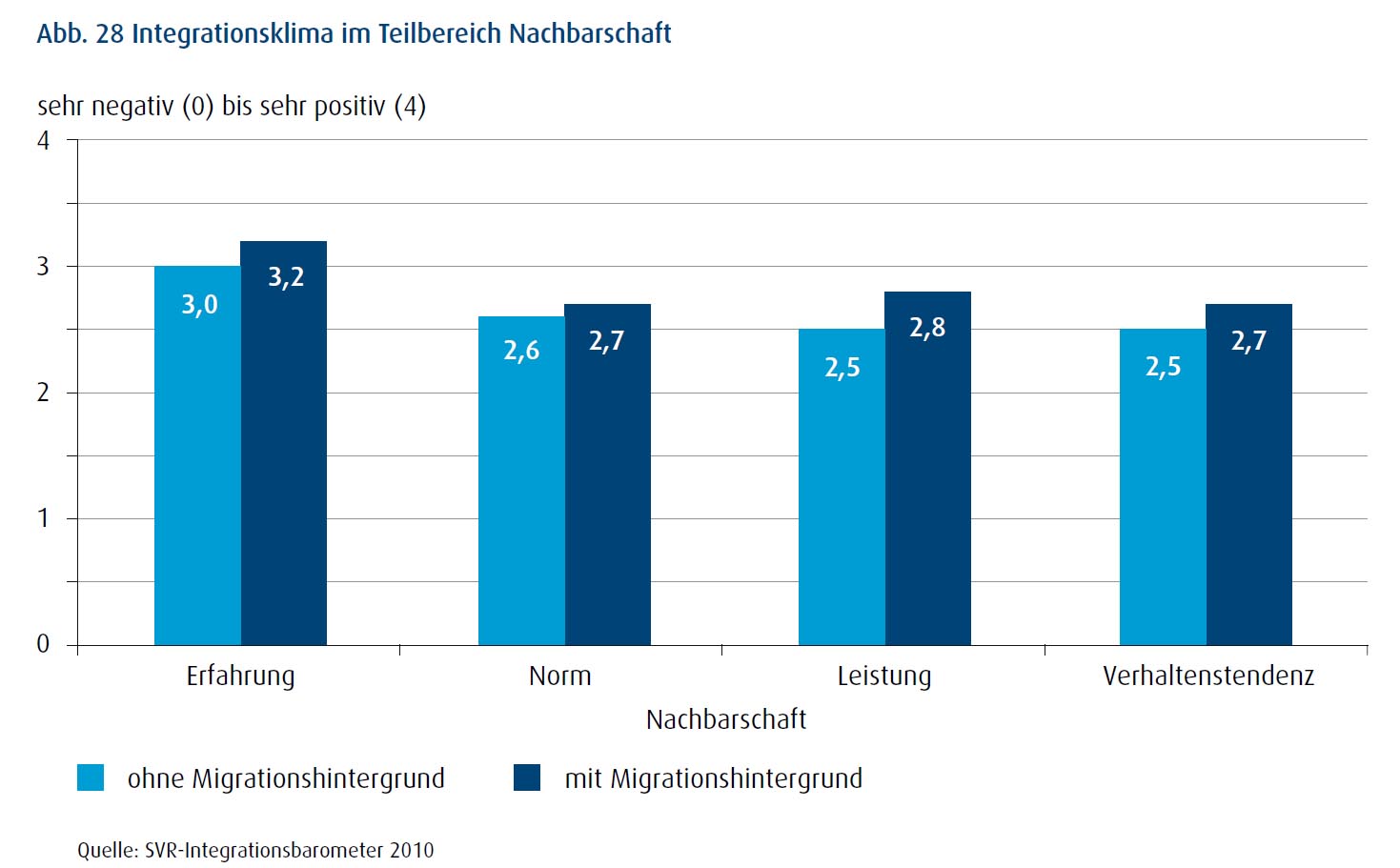 Der Sachverständigenrat deutscher Stiftungen für Integration und Migration (SVR) hat in seinem Integrationsbarometer zur Einwanderungsgesellschaft 2010 auch den Themenkomplex Wohnen und Quartier beleuchtet, da das Zusammenleben in der Nachbarschaft einen zentralen Integrationsschauplatz darstellt. Aus einer Reihe von Untersuchungen zeigt sich, dass weder „Parallelgesellschaften“ noch Abschottung die Situation prägen.