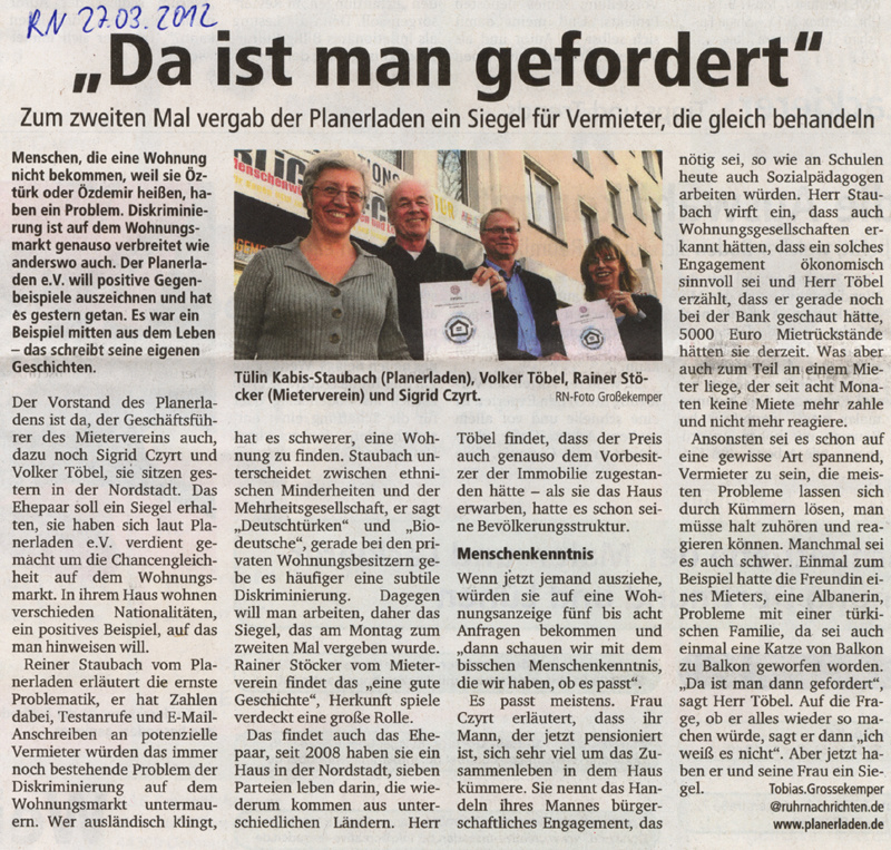 Die Privateigentümer Czyrt und Töbel erhalten vom Planerladen e.V. – unterstützt durch den Mieterverein Dortmund – im Kampf gegen Diskriminierung das Siegel „Herkunftsunabhängige Gleichbehandlung bei Vermietung“.
