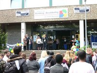 Frau Helena Breidt von MIADO-KI (dem Kommunalen Integrationszentrum der Stadt Dortmund) überreichte dem Schülervertreter Timo Schulze mit zusprechenden Worten die Auszeichnung. Den Abschluss fand die Veranstaltung mit dem Start von über 200 Ballons, die die bunte Vielfalt der Schule – Schüler/innen aus mehr als 60 Nationen – angemessen repräsentierten.