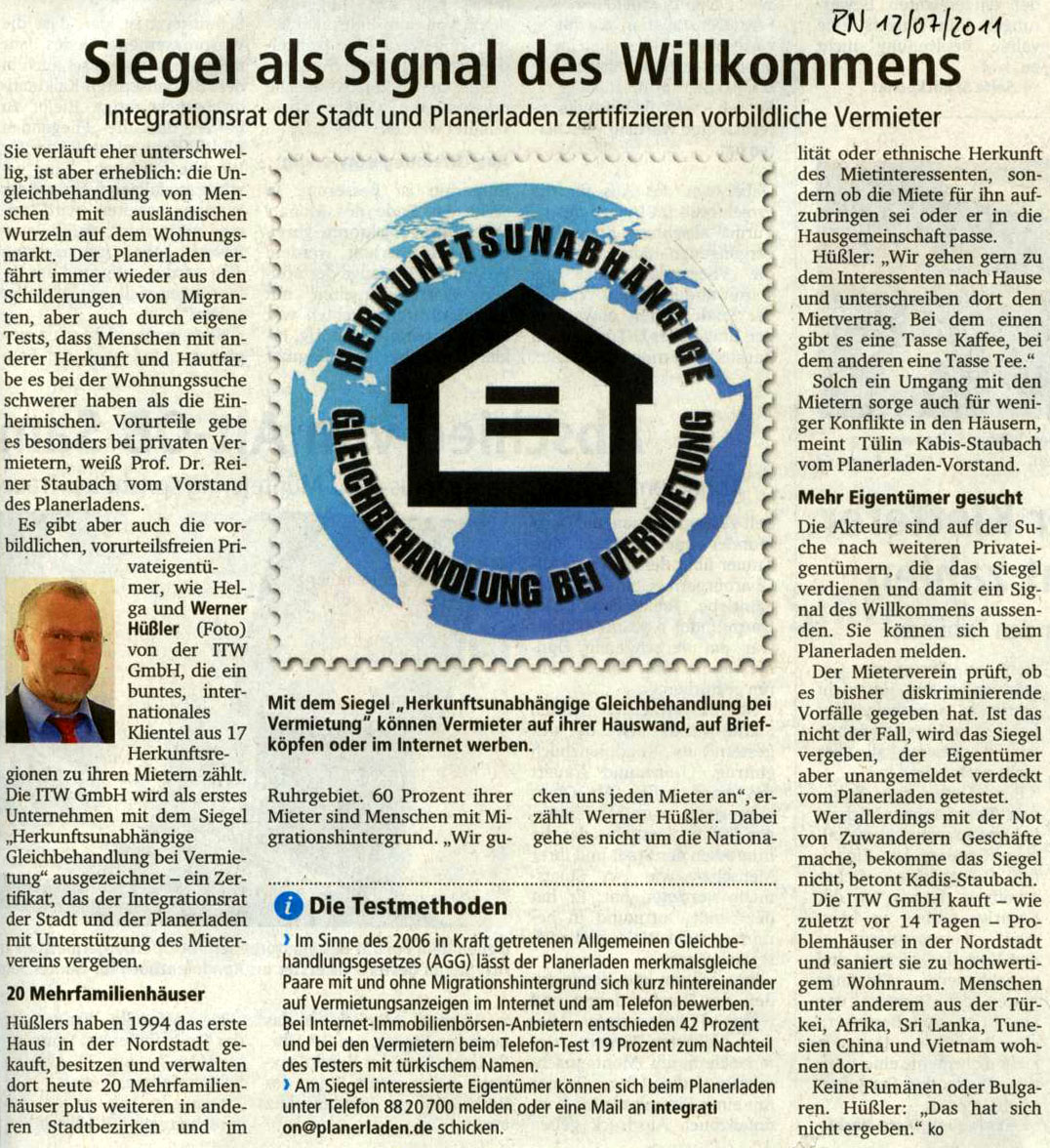 Zu den positiven Beispielen gehören die Privateigentümer Helga und Werner Hüßler von der ITW GmbH. Sie haben sich den Leitsatz der herkunftsunabhängigen Gleichbehandlung bei der Vermietung ihrer Immobilien groß auf die Fahnen geschrieben und den Gedanken der Antidiskriminierung und der Gestaltung von Vielfalt schon lange in ihr Unternehmensleitbild aufgenommen. Daher haben der Integrationsrat der Stadt Dortmund gemeinsam mit dem Planerladen e.V., unterstützt durch den Mieterverein Dortmund und Umgebung e.V., sich dazu entschlossen, die ITW GmbH als erstes Unternehmen mit ihrem Siegel im Rahmen der Kampagne „Herkunftsunabhängige Gleichbehandlung bei Vermietung“ – ganz im Sinne des Allgemeinen Gleichbehandlungsgesetzes (AGG) – auszuzeichnen.