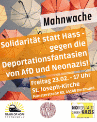 Der Stadtteil Marten hat am 19. Februar den Anfang gemacht, die Nordstadt zieht nach, denn es ist klar: Wir schweigen nicht! Train of Hope rufen gemeinsam mit dem Planerladen und „NOrdstadt gegen Nazis“ zur Mahnwache am Freitag (23.02) an der St. Joseph-Kirche (Münsterstraße 63, 44145 Dortmund) auf. Unter dem Motto: „Solidarität statt Hass - gegen die Deportationsfantasien von AfD und Neonazis!“ wollen wir ab 17 Uhr Flagge für ein tolerantes und demokratisches Miteinander und gegen Hass und Hetze zeigen.