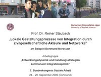 Der 7. Bundeskongress Soziale Arbeit, der am 25.03.2009 in Dortmund stattfand, beschäftigte sich mit den Themen „Entwicklungsdynamik und Handlungsstrategien kommunaler Integrationspolitik“. Integration geschieht vor Ort in den Städten und Gemeinden; leider ist kommunale Integrationspolitik immer noch ein viel zu wenig beleuchtetes Handlungsfeld. Vordergründiges Ziel des Kongresses war es daher, Wissen über kommunale Integrationspolitik zu vermitteln.