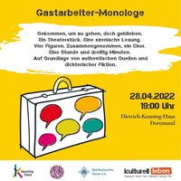 Gekommen, um zu gehen, doch geblieben. Mesut Bayraktars "Gastarbeiter-Monologe" lassen die Zuschauenden eintauchen in die Zeit, in der sich viele so genannte Gastarbeiter*innen mit viel Mut und Hoffnung im Gepäck auf den Weg nach Deutschland machten. Sie erzählen vom Ankommen und Ausgrenzung, von Heimweh und der Suche nach Anerkennung, von Träumen und Enttäuschungen.
