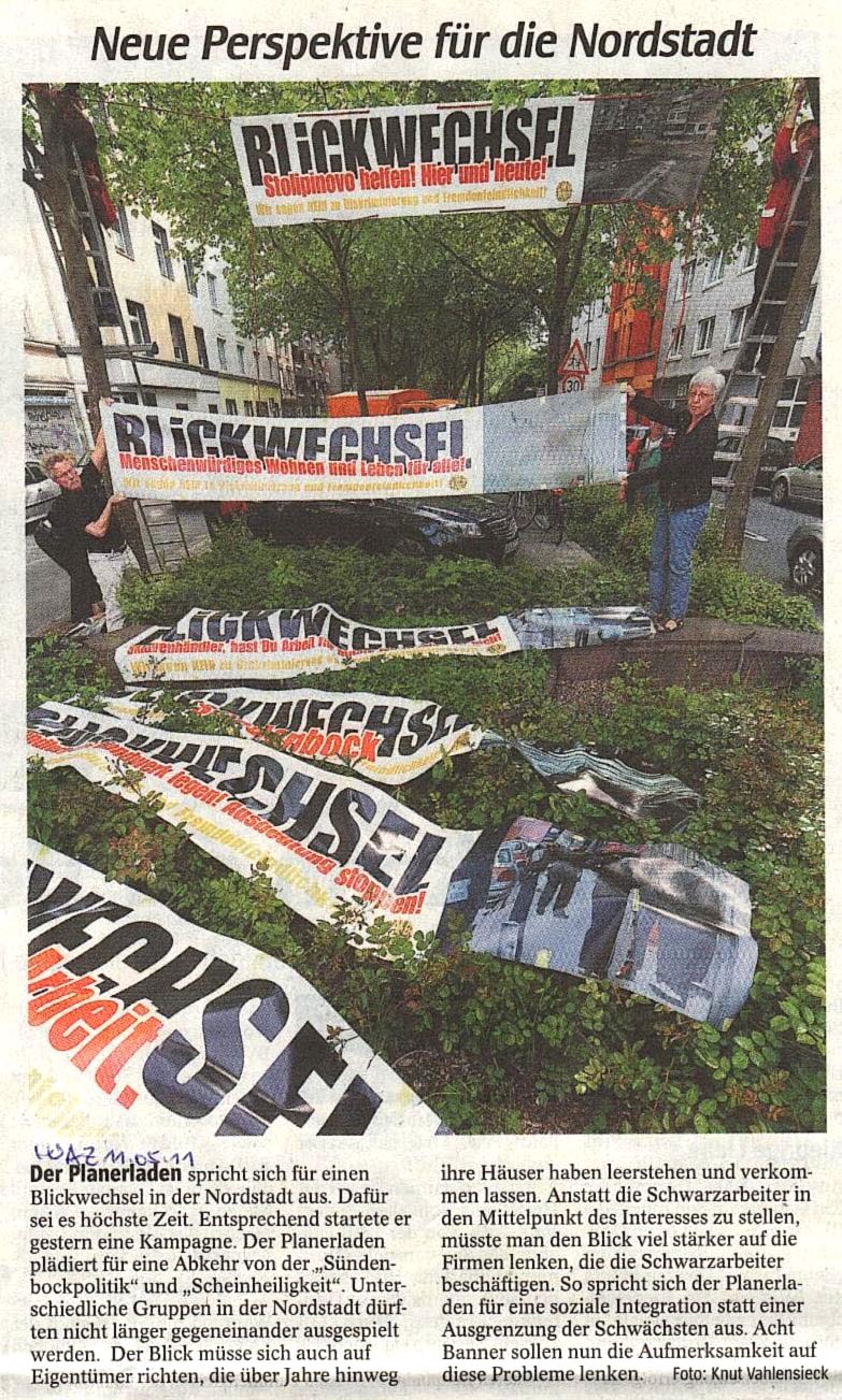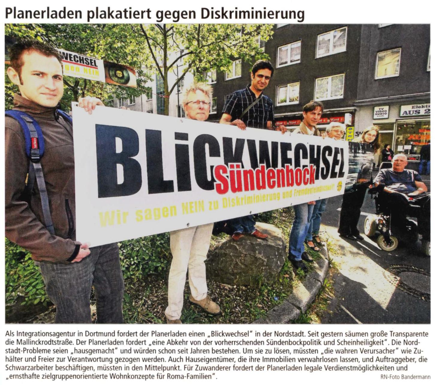 Mit unseren Bannern der Kampagne „Blickwechsel“ rufen wir alle zum Kampf gegen Diskriminierung und Fremdenfeindlichkeit auf! Sieben Banner hängen entlang der Mallinckrodtstraße und ein achtes Banner am Standort der Integrationsagentur in der Schützenstraße 42. Ziel der Aktion ist es, die Öffentlichkeit auf die oben genannten Problemfelder in der Dortmunder Nordstadt aus einem anderen Blickwinkel aufmerksam zu machen, sie für die eigentliche Problematik und somit für das Wesentliche zu sensibilisieren, indem der Blick auf die wahren Verursacher gelenkt wird und eine aufgeklärte Diskussion in Gang kommt.