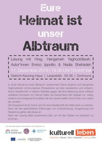 Die Mitherausgeberin Hengameh Yaghoobifarah sowie die Mitautor*innen Nadia Shehadeh und Enrico Ippolito sind im Rahmen der Veranstaltungsreihe „Kulturell Leben“ zu Gast in Dortmund, um über Heimatverständnis, Zusammenleben und Rassismus zu diskutieren.