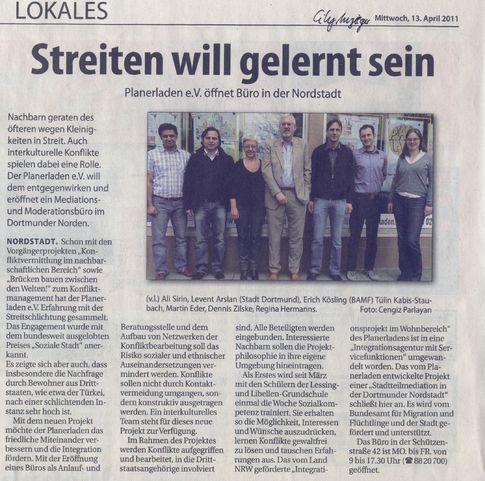 Der Planerladen e.V. hat mit den Vorgängerprojekten „Konfliktvermittlung im nachbarschaftlichen Bereich“ (2000- 2004) sowie „Brücken bauen zwischen den Welten!“ (Laufzeit 2006 - 2009) im Handlungsfeld „Konfliktmanagement“ Pionierarbeit vollbracht. Ein deutlicher Beleg dafür war nicht zuletzt die Anerkennung im Rahmen des bundesweiten Preises „Soziale Stadt“ in 2004. Zugleich konnte aufzeigt werden, welchen Beitrag die konstruktive Konfliktbearbeitung zur Sicherung des sozialen Friedens in der Nachbarschaft leisten kann. Hier zeigte sich aber auch, dass insbesondere die Nachfrage durch Bewohner aus sog. Drittstaaten (v.a. Türkei und Marokko) nach einer moderierenden Instanz sehr hoch ist.