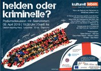 In der Podiumsdiskussion am 9.4. im Dietrich-Keuning-Haus kamen drei Akteur/innen der Organisationen Sea-Watch, Sea-Eye und Mission Lifeline zu Wort. Thematisiert wurden u.a. das Sterben im Mittelmeer, die Abschottung Europas sowie die Kriminalisierung der Helfer/innen der Organisationen.