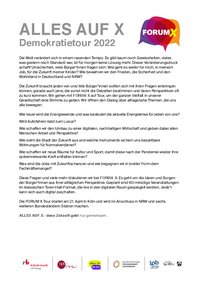 Die Zukunft braucht jeden von uns! Alle Bürger*innen sollten sich mit ihren Fragen einbringen können, gerade auch jene, die sonst nicht die Debatten bestimmen und deren Perspektiven oft zu kurz kommen. Wir gehen mit FORUM X auf Tour, um der ganzen Vielfalt in unserer Gesellschaft eine Stimme zu geben. Wir öffnen den Dialog über alltagsnahe Themen, die uns alle bewegen: